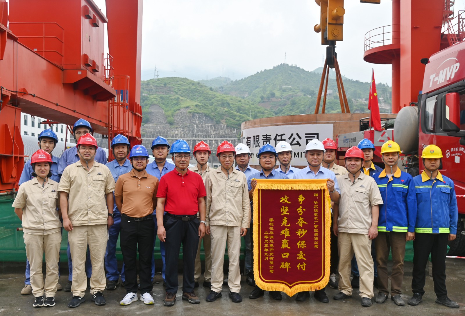 26日上午,現(xiàn)場(chǎng)各單位立即投入到吊裝前的準(zhǔn)備工作中。攀水電公司全程跟進(jìn)機(jī)電安裝進(jìn)展,逐一確認(rèn)安裝條件;施工單位技術(shù)人員按吊裝方案全面落實(shí)安全交底與技術(shù)措施,確保萬(wàn)無(wú)一失;在各項(xiàng)準(zhǔn)備工作全面就緒的基礎(chǔ)上,6號(hào)機(jī)組的轉(zhuǎn)子支架平穩(wěn)、精準(zhǔn)吊裝就位。川投能源副總經(jīng)理、攀水電公司黨總支書記、董事長(zhǎng)徐孝剛現(xiàn)場(chǎng)督導(dǎo)吊裝工作,充分肯定了哈電公司在本次極端條件下的運(yùn)輸成績(jī),并向哈爾濱電機(jī)廠有限責(zé)任公司授予錦旗,感謝其長(zhǎng)期以來(lái)對(duì)銀江水電站建設(shè)的大力支持。
