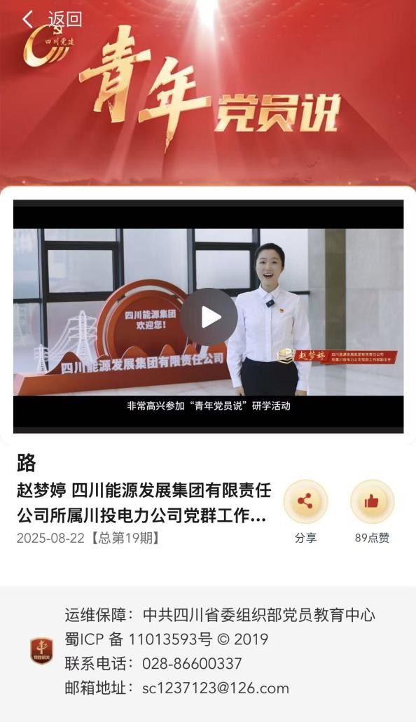 近期,四川省委組織部舉辦的“青年黨員說”研學活動正在四川黨建官網(wǎng)等平臺集中展播。省國資委黨委共推薦10名青年黨員代表圍繞“學習新思想,爭當改革先鋒”為主題,談體會、談感悟。其中,由四川能源發(fā)展集團上報、川投能源推薦的作品《路》,通過講述“兩路”精神的歷史內(nèi)涵,結合川投電力腳基坪電廠震后緊急搶險、天彭電力鳳鳴湖水庫飲水廊道清淤、玉田電廠為涼山州彝族村民送水送電等鮮活事例,展現(xiàn)能源人在逆行搶險、為民服務和民族團結中的責任擔當,號召新時代國企人賡續(xù)“兩路”精神,汲取奮進力量,展現(xiàn)了能源國企的使命擔當。